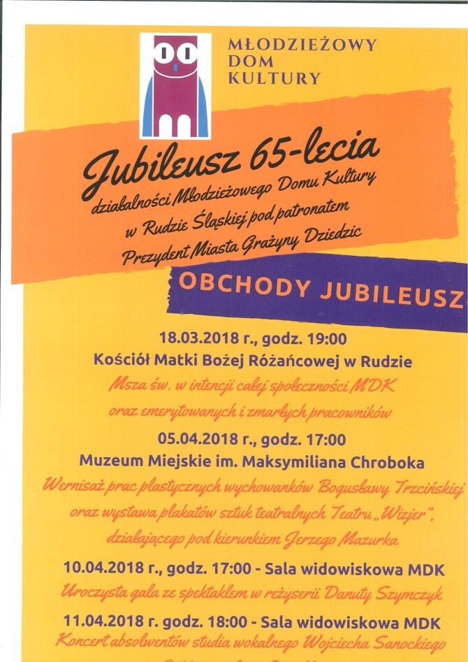 Młodzieżowy Dom Kultury zaprasza na kolejne wydarzenia związane z obchodami jubileuszu 65-lecia jego działalności (szczegóły na poniższym plakacie).
