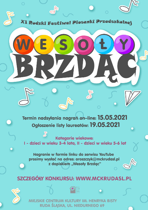 Festiwal „Wesoły Brzdąc” organizowany był w Miejskim Centrum Kultury im. Henryka Bisty w Rudzie Śląskiej w latach 2000-2010 i cieszył się sporym zainteresowaniem. W 2021 roku MCK wraca do tradycji organizowania tej sympatycznej imprezy, choć z uwagi na sytuację epidemiczną musi nieco zmodyfikować jej charakter i zrezygnować z eliminacji konkursowych przeprowadzanych na żywo. W zamian prosi o rejestrację audiowizualną utworów i przesłanie drogą elektroniczną. Nagrania te zostaną poddane ocenie jury, które wyłoni zwycięzców w dwóch kategoriach wiekowych (3-4 lata i 5-6 lat) oraz według podziału na solistów i zespoły.