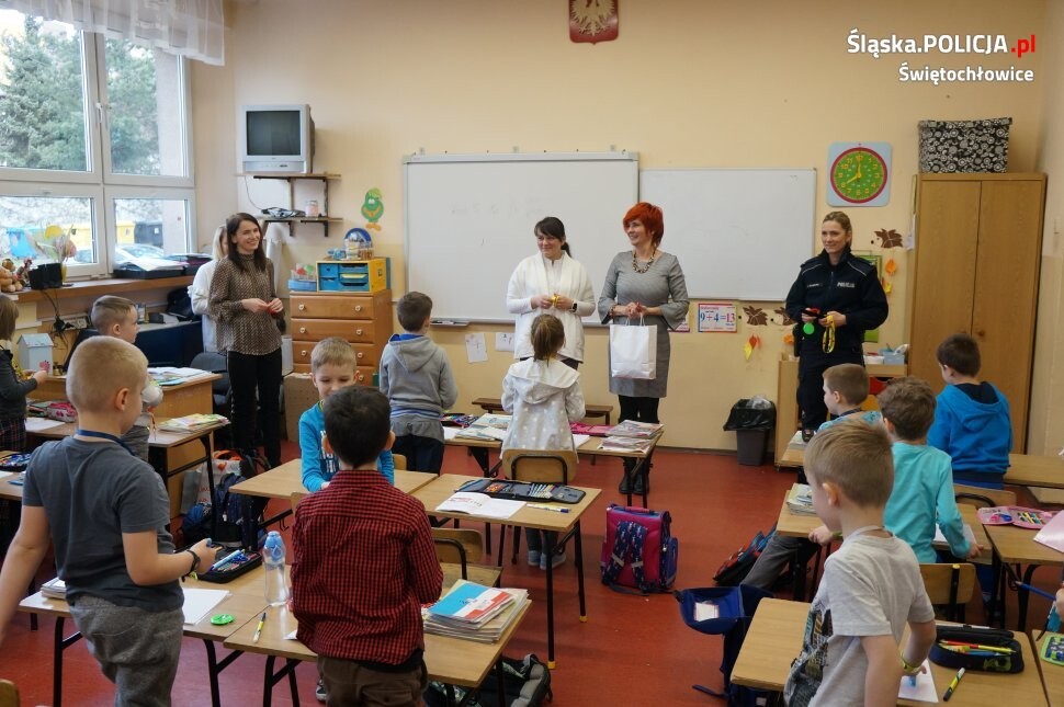 Wczoraj policjantka z wydziału prewencji świętochłowickiej komendy odwiedziła miejscową Szkołę Podstawową nr 4 i 8. W ramach współpracy mundurowa wspólnie z Panią Dyrektor Justyna Kramorz z CKŚ Zgoda rozdawała odblaski z napisem „Stop Alkohol”. Ich wizyta we wspomnianych szkołach miała związek z ubiegłorocznym spotkaniem mikołajkowym, które odbyło się w świętochłowickim Centrum Kultury Śląskiej. W trakcie grudniowego spotkania z uczniami mundurowa wygłosiła prelekcję na temat uzależnień, zarówno od narkotyków, jak i alkoholu. Podczas wykładu wyemitowano film, którego celem jest przekazanie słuchaczom jak szkodliwe i niebezpieczne są środki psychoaktywne. Poruszona została również problematyka negatywnych konsekwencji ich zażywania. Wczorajsze spotkanie było finałem grudniowej akcji. W trakcie rozdawania odblaskowych gadżetów policjantka przypominała oraz przestrzegała przed eksperymentowaniem z używkami. Świętochłowicka profilaktyk wychodzi z założenia, że edukacja jest najważniejsza, dlatego korzysta z każdej okazji, aby rozmawiać z młodymi mieszkańcami miasta na temat szeroko rozumianego bezpieczeństwa. Celem każdego spotkania jest zwiększanie świadomości młodych ludzi na temat zagrożeń związanych z zażywaniem narkotyków i dopalaczy, w tym konsekwencji zarówno zdrowotnych, prawnych, jak i społecznych uzależnienia od tych substancji oraz od napojów alkoholowych. Odblaski które otrzymała młodzież, mają nie tylko przestrzegać, ale również zwiększyć ich bezpieczeństwo w trakcie drogi do i ze szkoły.