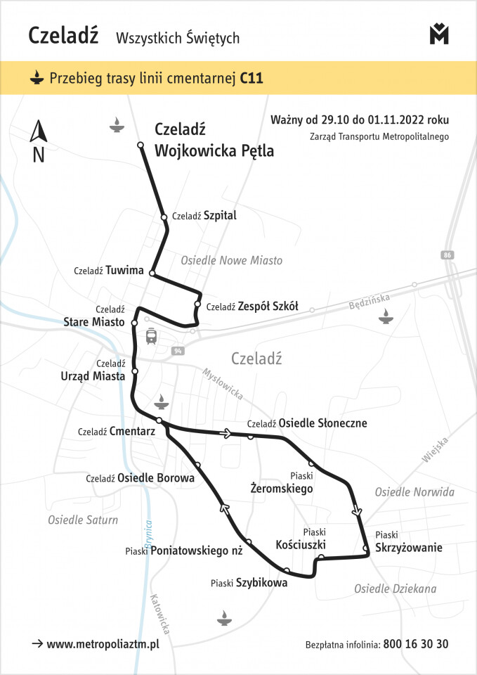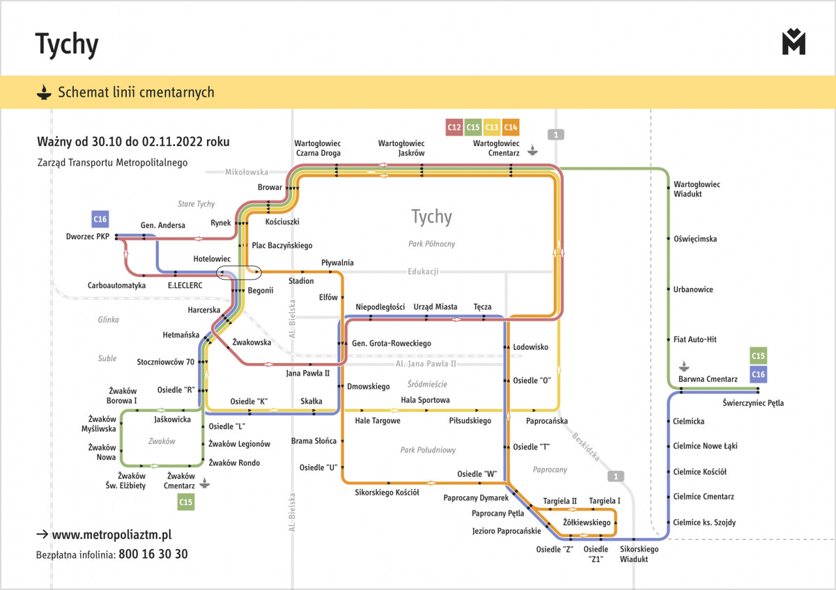 Szczegółowe informacje dotyczące zasad funkcjonowania komunikacji miejskiej w okresie 28 października – 2 listopada znajdują się na stronie internetowej ZTM w zakładce Aktualności – Komunikaty. W tym miejscu, poza opisami zmian tras poszczególnych linii, znajdują się także mapy ilustrujące trasy specjalnych linii cmentarnych. Pasażerowie, którzy we Wszystkich Świętych i wcześniej planują korzystanie z komunikacji miejskiej, w przypadku jakichkolwiek pytań mogą dzwonić na bezpłatną i czynną przez całą dobę infolinię 800 16 30 30).