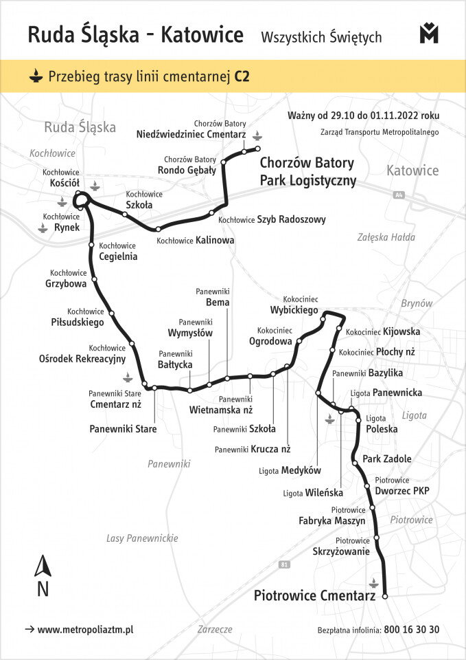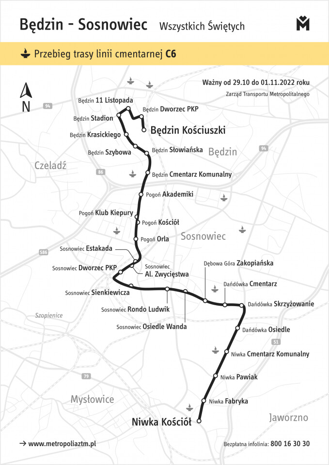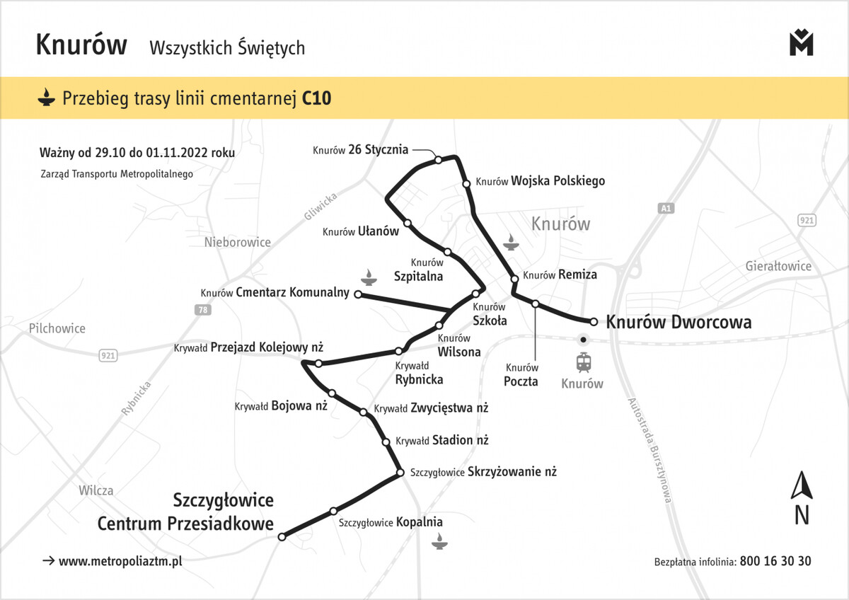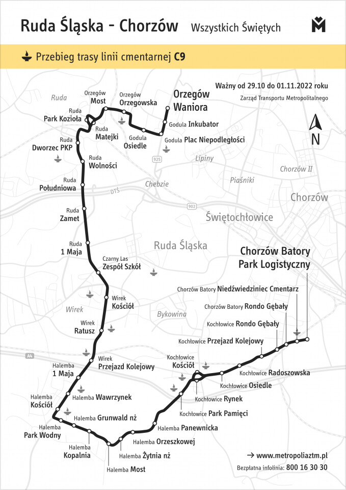 Największe modyfikacje czekają pasażerów w okresie 29 października – 2 listopada. ZTM zaplanował w tych dniach m.in. uruchamianie linii cmentarnych. 1 listopada będzie ich w sumie 16. Dzięki dodatkowym połączeniom łatwo będzie można dojechać na cmentarze w Będzinie (linia C6), Chorzowie (C2, C7, C9), Czeladzi (C11), Gliwicach (C1, C3 i C4), Katowicach (C2, C5 i C8), Knurowie (C10), Rudzie Śląskiej (C2, C9), Siemianowicach Śląskich (C7), Sosnowcu (C6) i Tychach (C12, C13, C14, C15 i C16). Dodatkowo, 1 listopada do przesiadki z aut osobowych ma zachęcać możliwość bezpłatnego korzystania z komunikacji miejskiej.