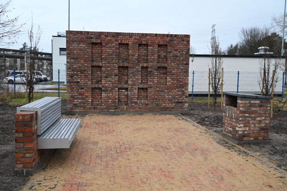 W centrum skweru znajduje się strefa pamięci – powstał nowy postument i placyk upamiętniający byłych więźniów obozu. Stworzono fragment ścianki z cegły; na niej niebawem pojawi się wizualizacja podobozu sprzed lat, a także elementy mające nawiązywać do wejścia na jego teren.