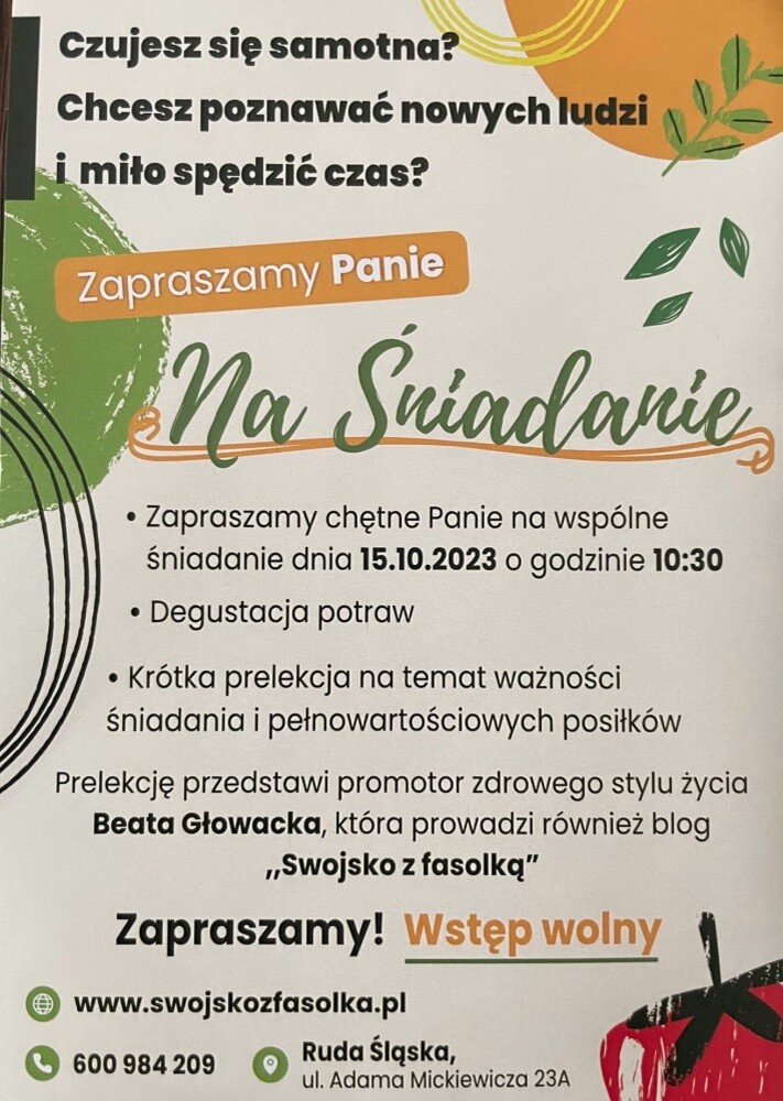 "Zapraszamy Panie na śniadanie" to nowy cykl spotkań śniadaniowych dla kobiet. Pierwsze spotkanie odbędzie się już 15 października w lokalu przy ul. Mickiewicza 23 A w Rudzie o godzinie 10:30.
