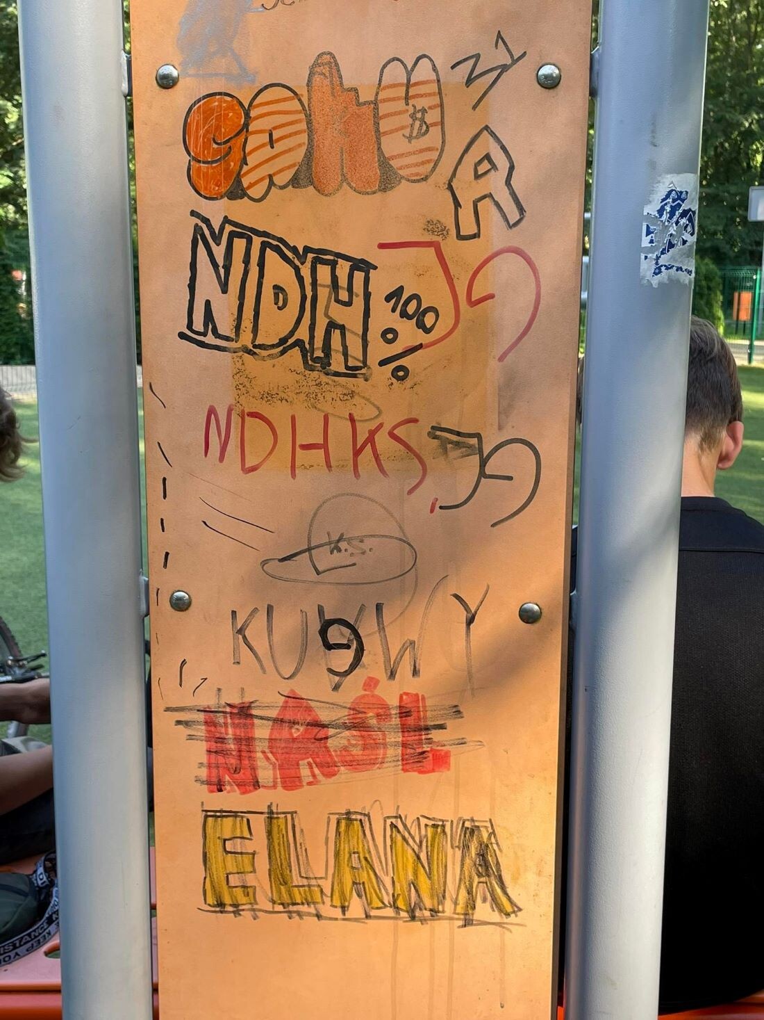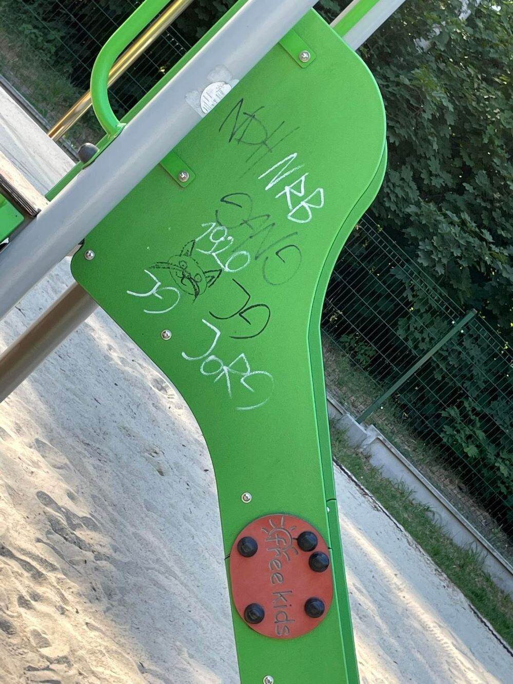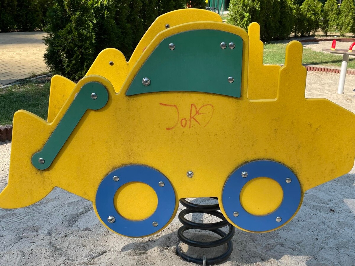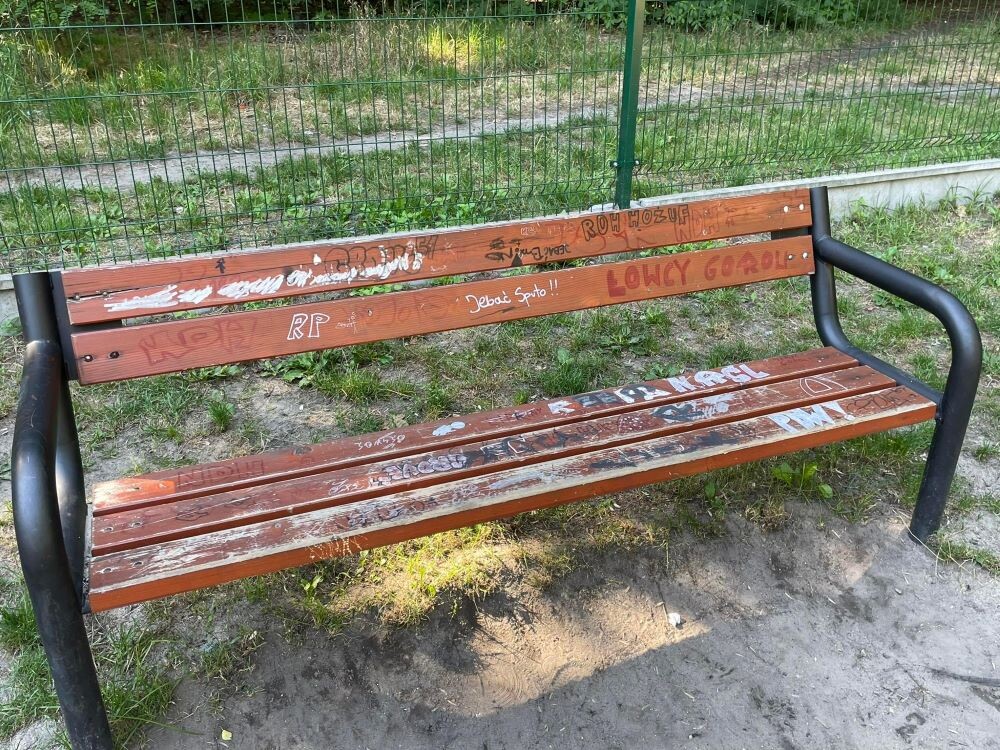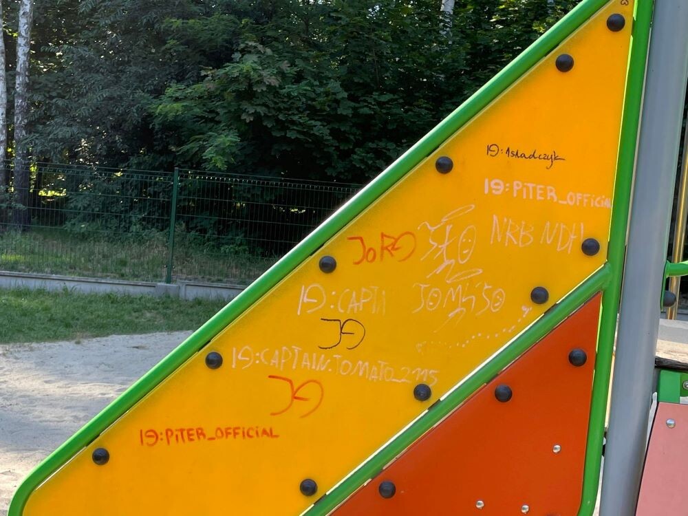 Niestety, większość obiektów znajdujących się na placu zabaw i siłowni padło ofiarą wandali. Na sprzętach pojawiły się m.in. obraźliwe napisy oraz symbole i hasła powiązane z klubami piłki nożnej. Co ciekawe, na zjeżdżalni wypisane są nazwy użytkowników serwisu Instagram. Oczywiście mogą, lecz nie muszą być to konta sprawców dewastacji.