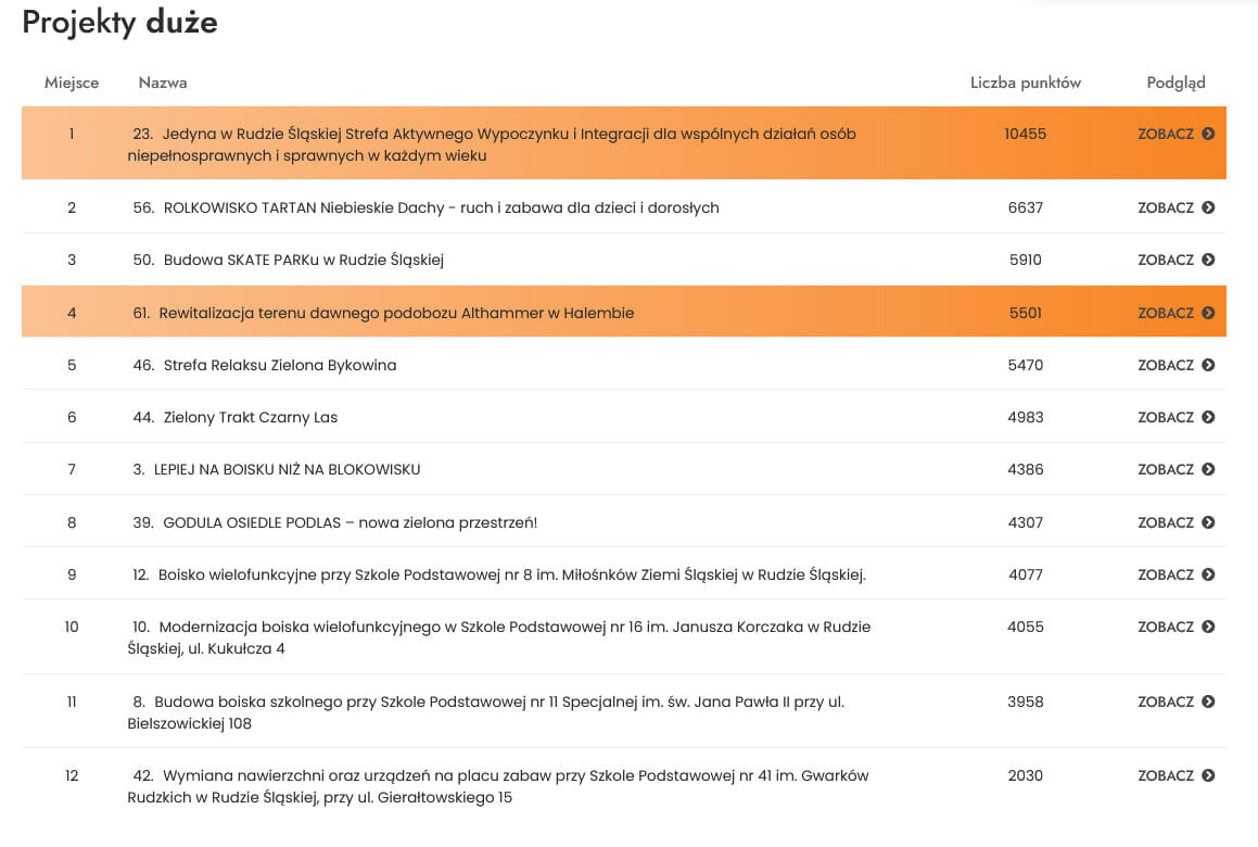 Przypomnijmy, że po raz drugi mieszkańcy Rudy Śląskiej głosowali zgodnie z nowym systemem. Każdy miał możliwość wskazania 4 zadań dużych i 4 małych, przy czym była to maksymalna liczba projektów, na które można było oddać głosy, czyli nie było konieczności wyboru wszystkich 8 zadań. Wybranym projektom, głosujący przydzielali się punkty – kolejno od 4 dla najwyżej ocenianego do 1 dla najniżej ocenianego.