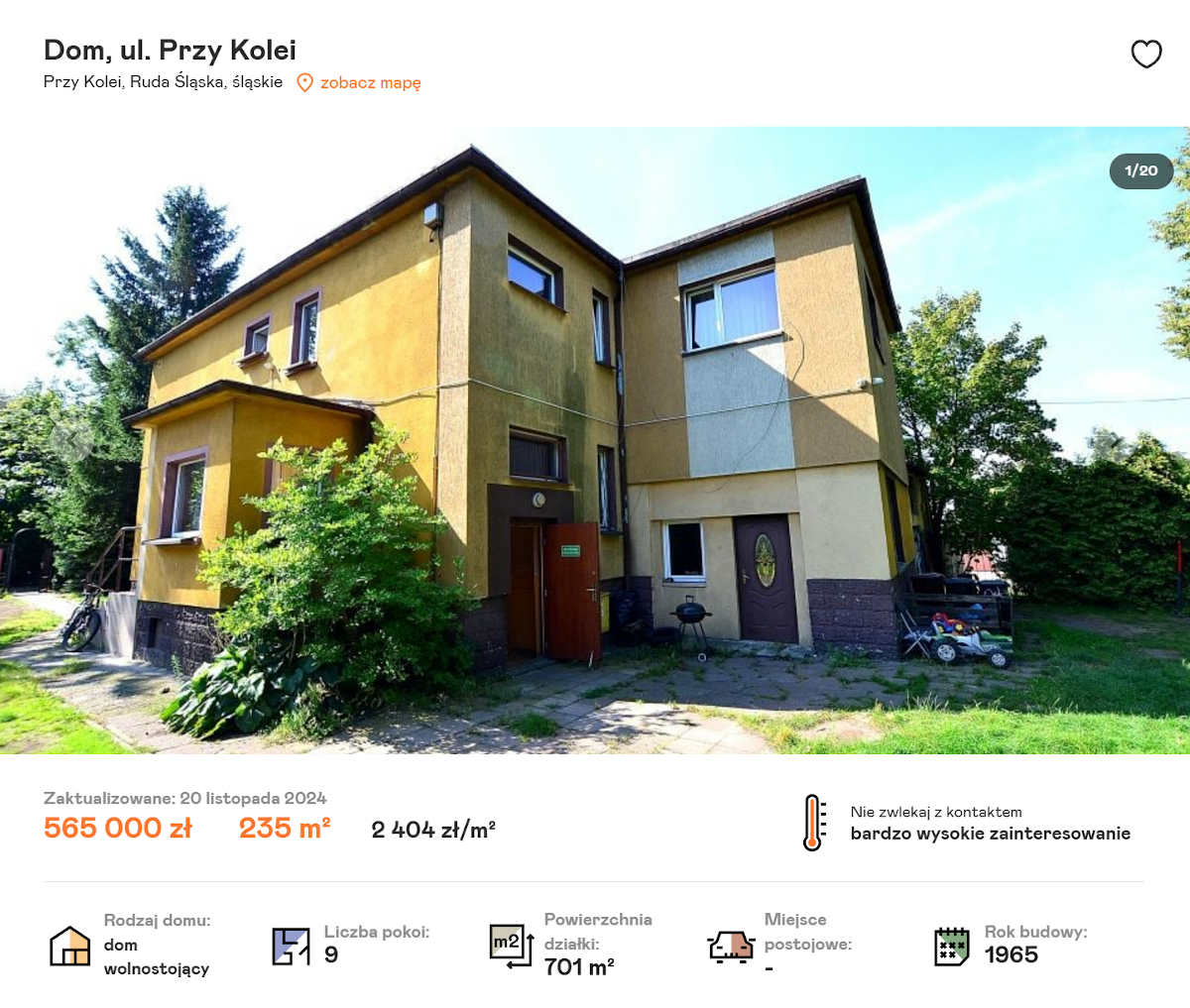 Na ulicy Przy Kolei w Rudzie Śląskiej wystawiono na sprzedaż dom z tarasem z 1965 roku. Nieruchomość obejmuje 9 pokoi, a jej powierzchnia to 235 metrów kwadratowych. Dom jest umeblowany i sprzedawany razem z zagospodarowaną działką, która ma 701 metrów kwadratowych. Aktualna cena zabudowy to 565 000 złotych, czyli za metr kwadratowy zapłacimy jedynie 2 404 złotych.