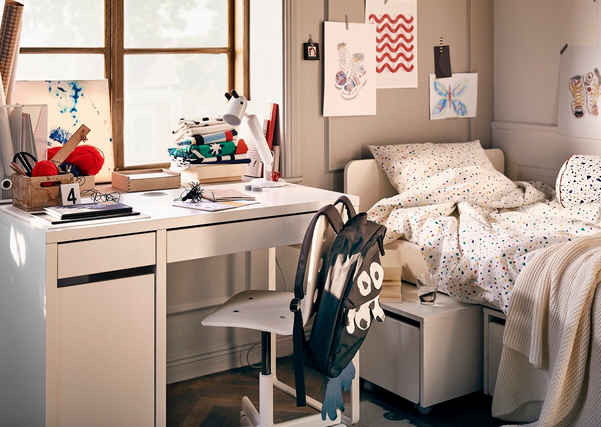 - Strefa nauki – to tu twoje dziecko będzie odrabiać lekcje (a prawdopodobne jest, że będzie ich coraz więcej). Podstawa to wygodne biurko i krzesło dostosowane do wzrostu dziecka. Zwróć uwagę, aby monitor komputera był na odpowiedniej, ergonomicznej wysokości, a jeśli twoja pociecha korzysta z laptopa, być może najlepszym rozwiązaniem będzie ustawienie go na specjalnej podkładce, dzięki czemu komputer będzie wyżej i pod wygodniejszym kątem. Bardzo ważne jest również oświetlenie – zapewnij dziecku lampkę do pracy o regulowanym ramieniu i mocnej żarówce. Biurko musi mieć również miejsce do przechowywania, np. szafkę i szufladkę. Jeśli to mało, wybierz jedno z biurek z nadstawką IKEA, na których zyskasz dodatkowe miejsce do przechowywania.