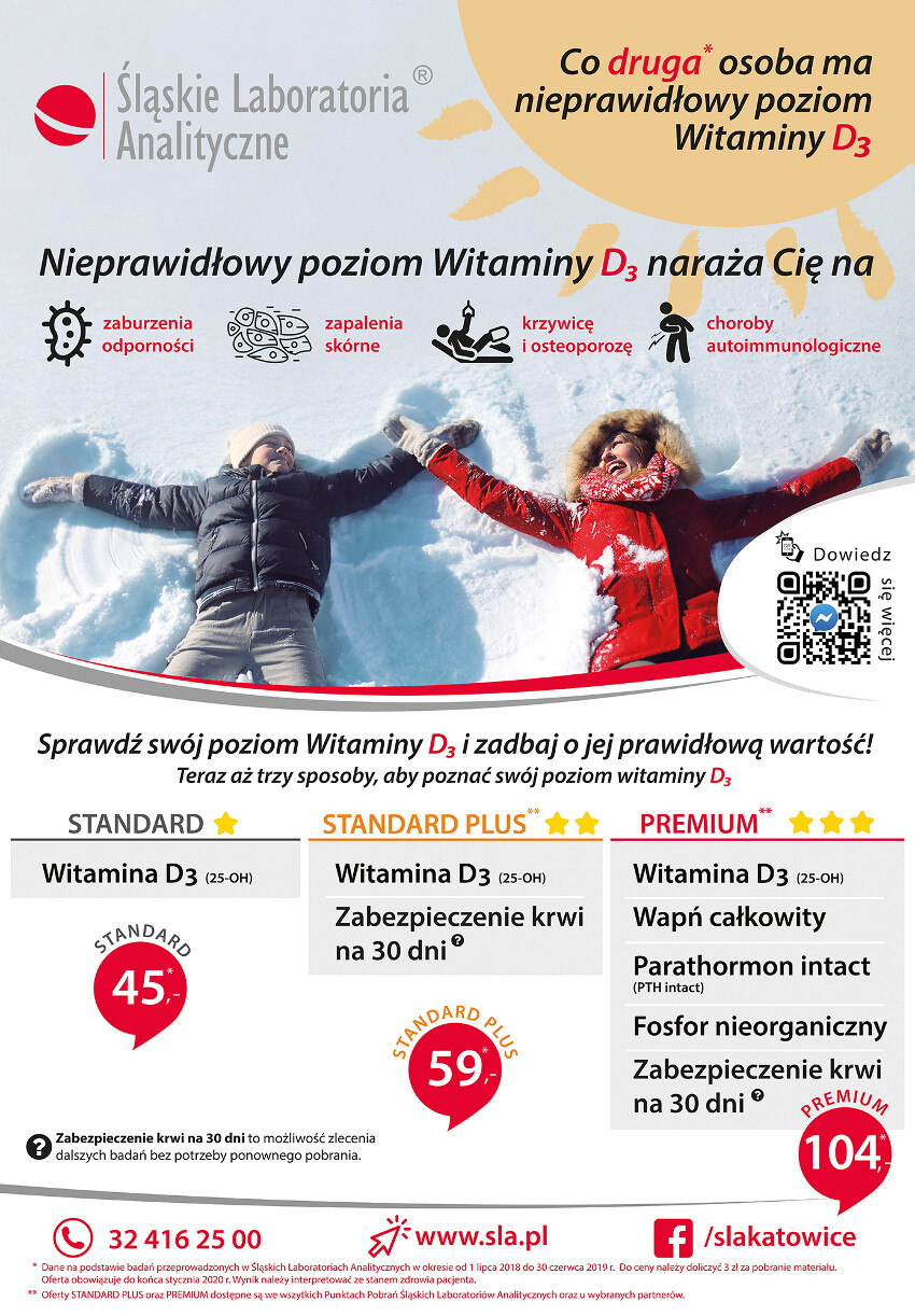 W styczniu 2020 roku Śląskie Laboratoria Analityczne przygotowały specjalną ofertę cenową na badanie poziomu witaminy D3 (kalcydiolu) w organizmie. Wykonując badanie w styczniu zaoszczędzisz 20 zł! Sprawdź szczegóły!